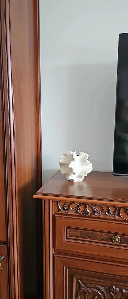 Bring a touch of luxury into your home with this stunning ceramic vase. Its geometric wavy patterns and petal shape create an elegant centerpiece that doubles as a functional piece for your favorite floral arrangements. The porcelain ensures it's both durable and sophisticated, making it perfect for any decor style. Whether placed in your living room, bedroom, or office, this vase adds a chic touch that enhances every space.